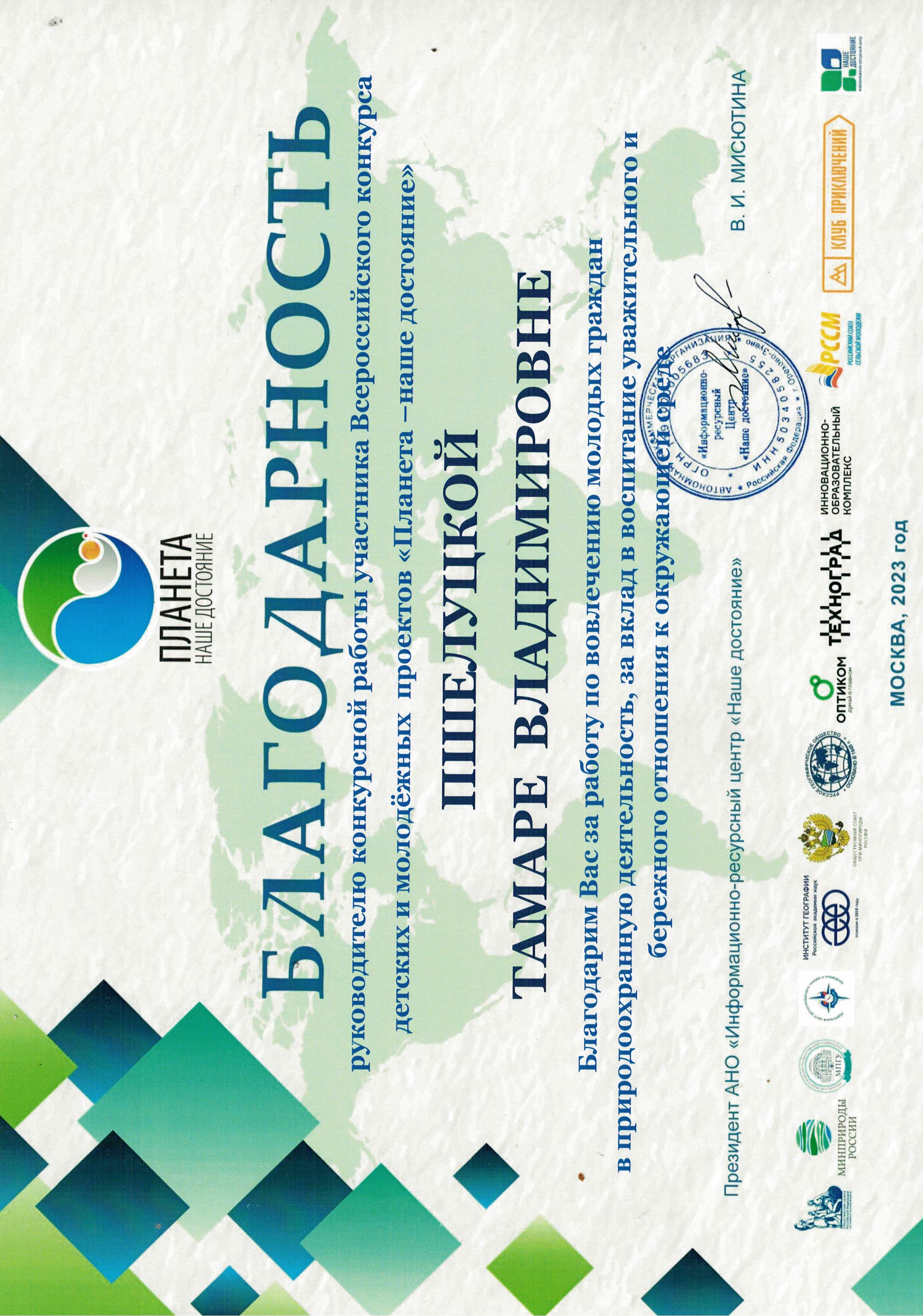 3 .Всероссийский конкурс «Планета-наше достояние» 3-4.07.23, г.Москва Победители заочного тура и призеры очного тура Всероссийского конкурса детских и молодѐжных проектов «Планета – наше достояние», который проводится по инициативе АНО «Информационно-ресурсный центр «Наше достояние» при информационной поддержке Минприроды Российской Федерации, Общественной палаты Российской Федерации.