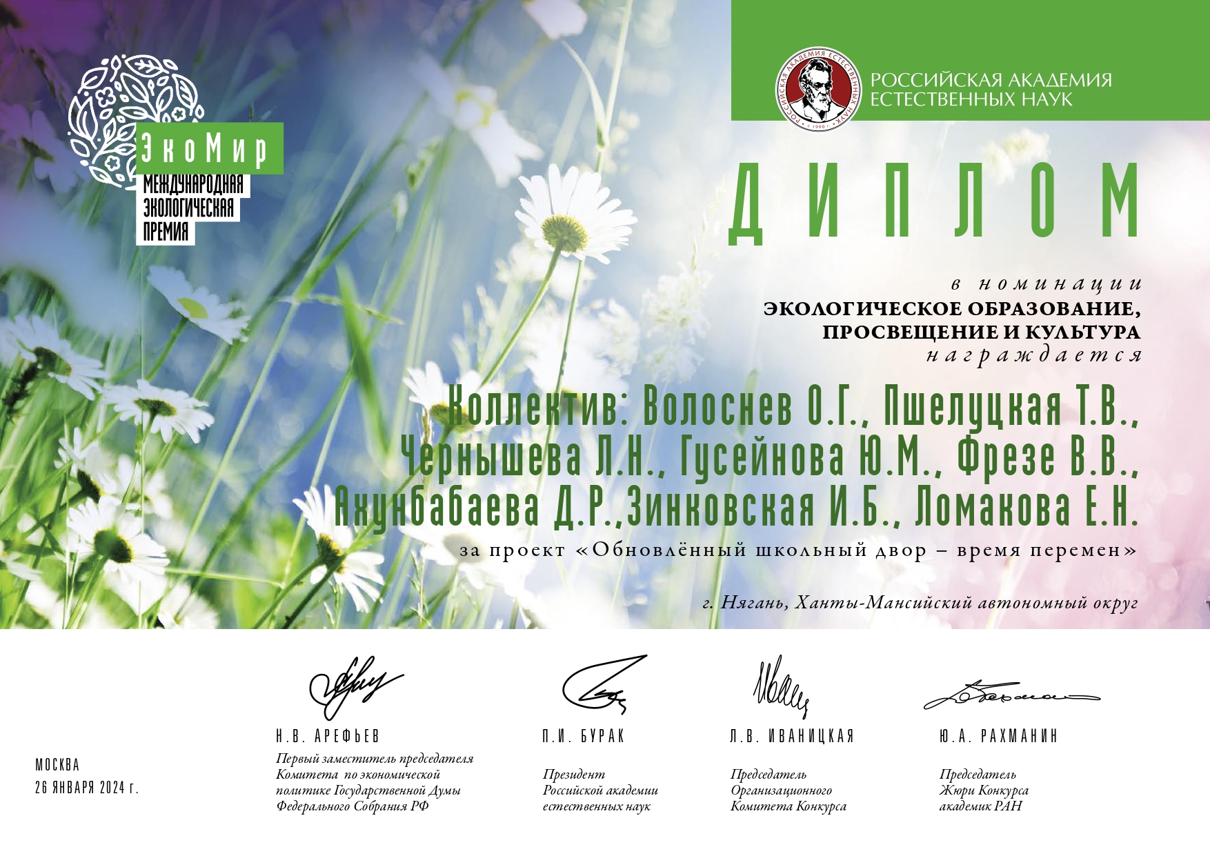 1. Международная экологическая Премия «ЭкоМир2023» является общественной наградой за выдающиеся достижения в охране окружающей среды и обеспечении экологической безопасности, а также в иной экологической деятельности, направленной на устойчивое развитие в XXI веке, сохранение биологического разнообразия. Наш проект награжден Дипломом от Российской Академии Естественных наук, 26.01.2024 г. г.Москва.