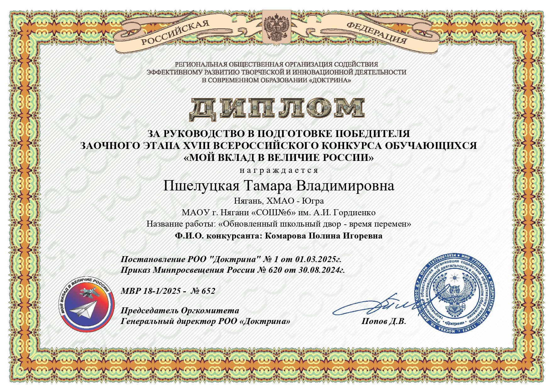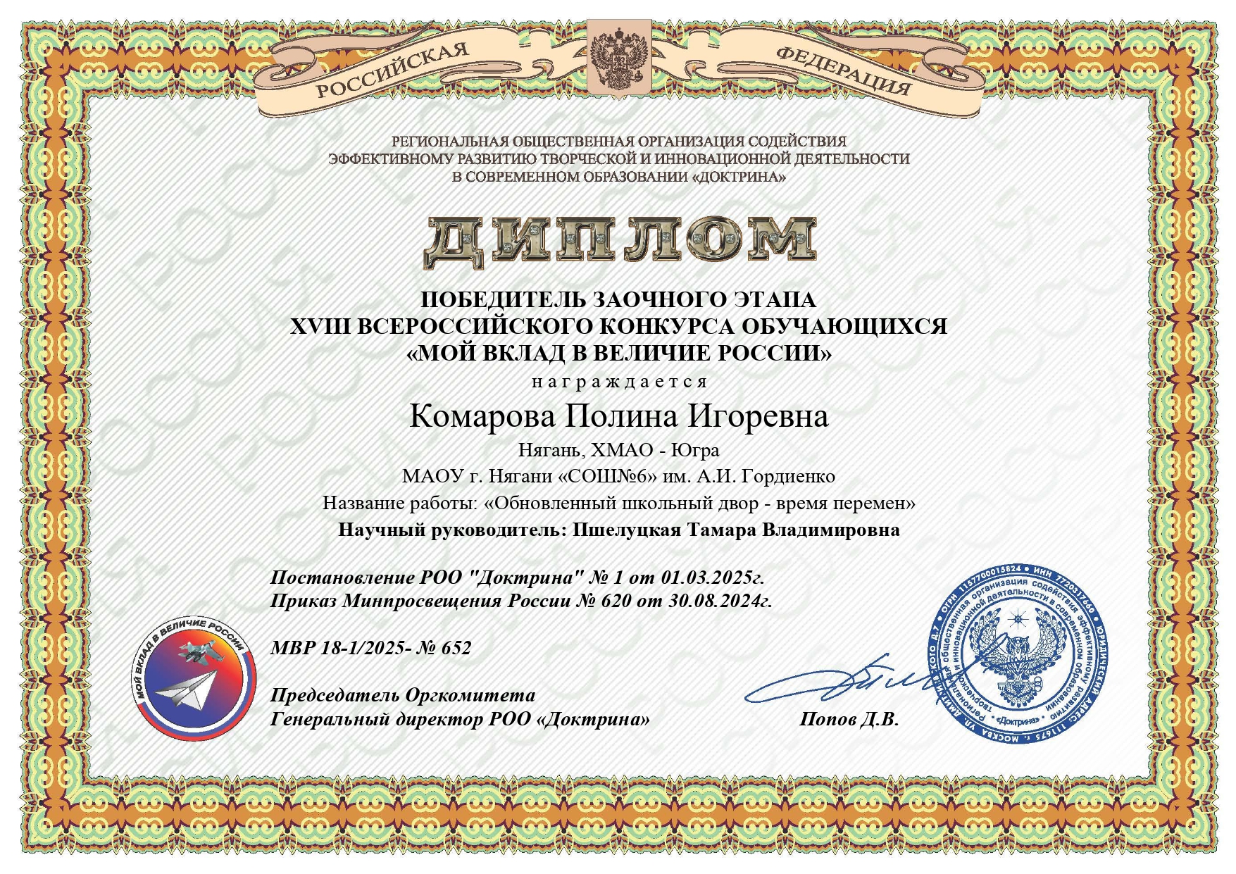 5. Победителями заочного этапа всероссийского конкурса обучающихся "Мой вклад в величие России" , 2025, г.Москва