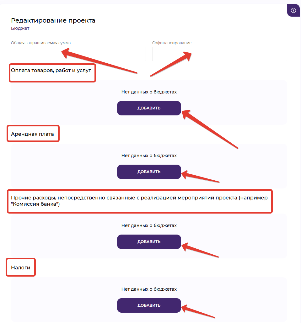 В открывшемся окне необходимо внести все сведения о бюджете проекта