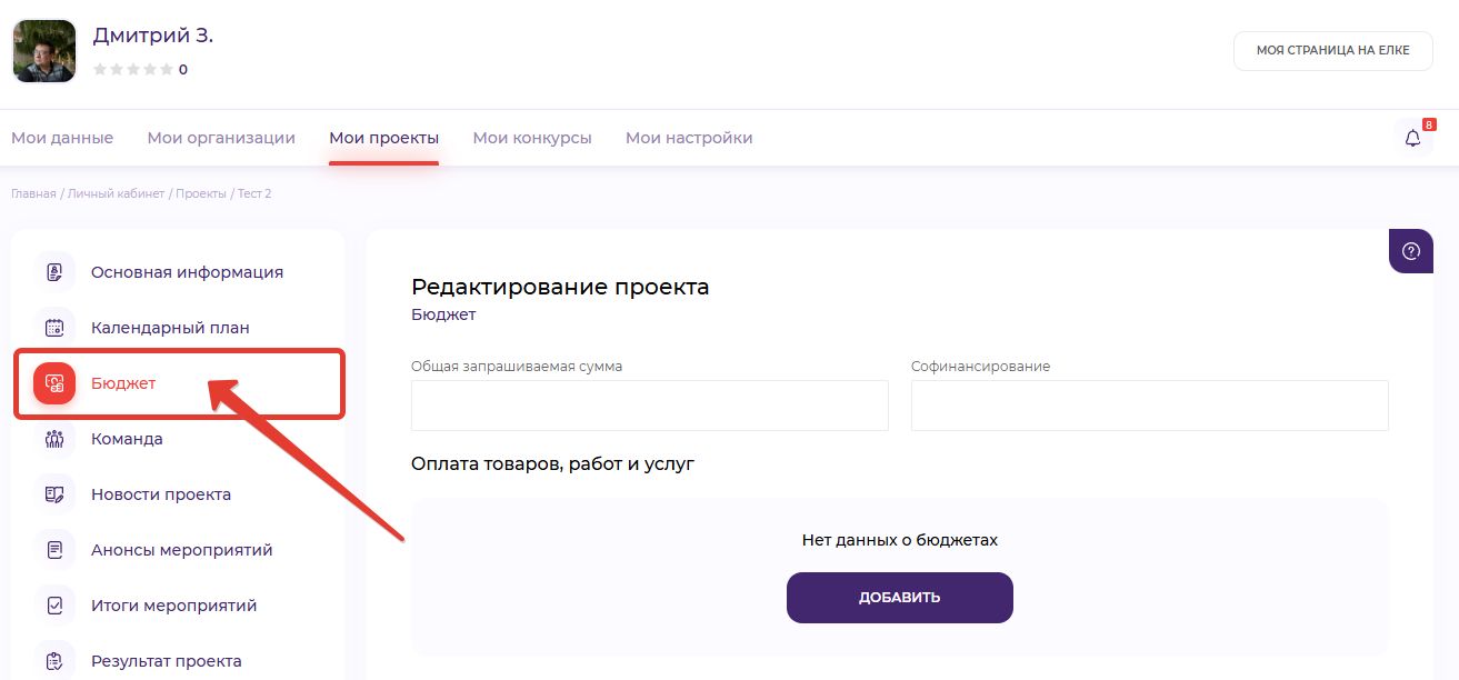 В данной статье мы с вами добавим бюджет вашего проекта. Для этого вам необходимо в окне редактирование проекта перейти в пункт меню "бюджет"