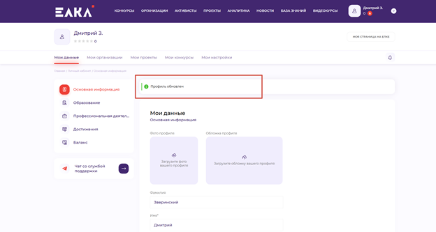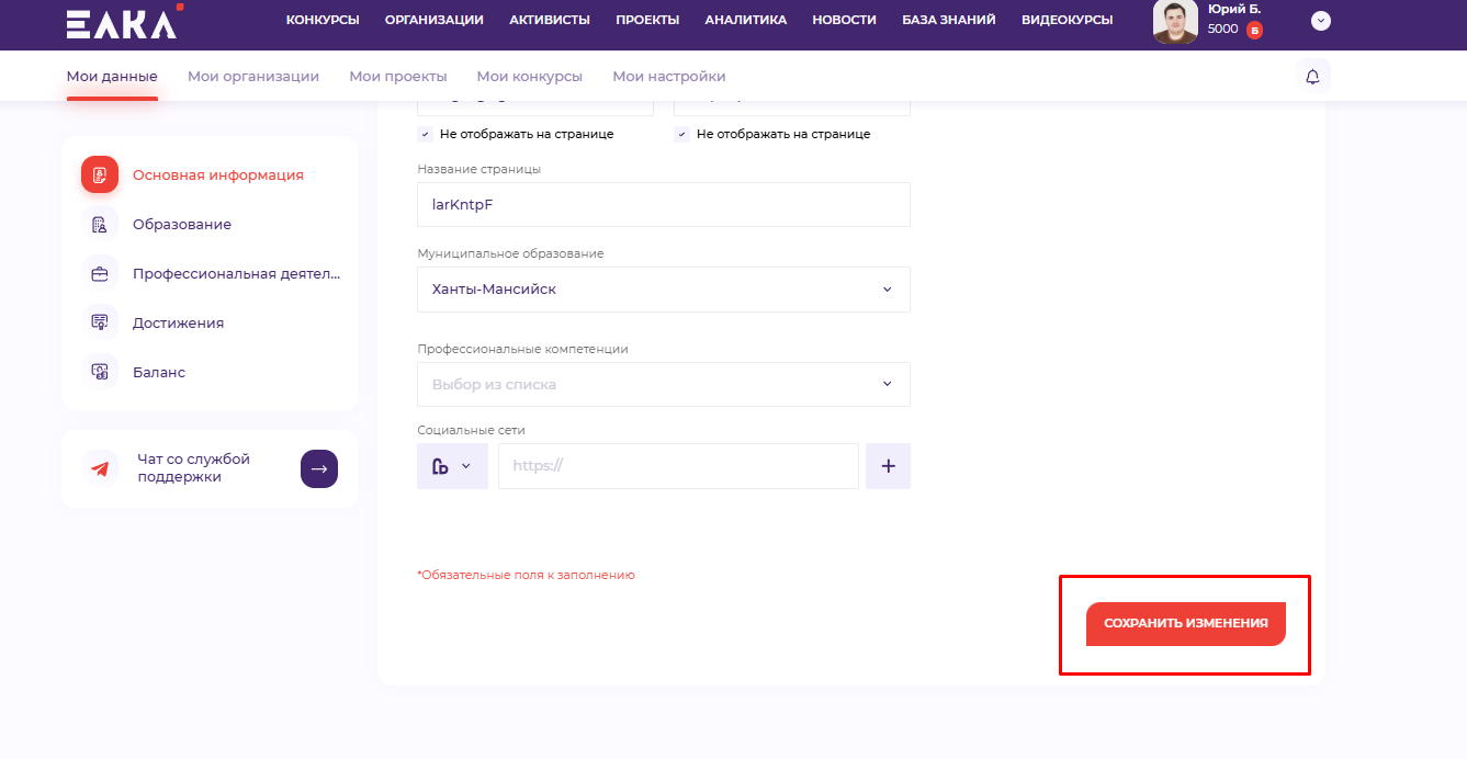После ввода информации по всему разделу не забудьте нажать красную кнопку “Сохранить изменения”, после нажатия вверху страницы отобразиться результат сохранения, обратите на него внимание, должно быть так: