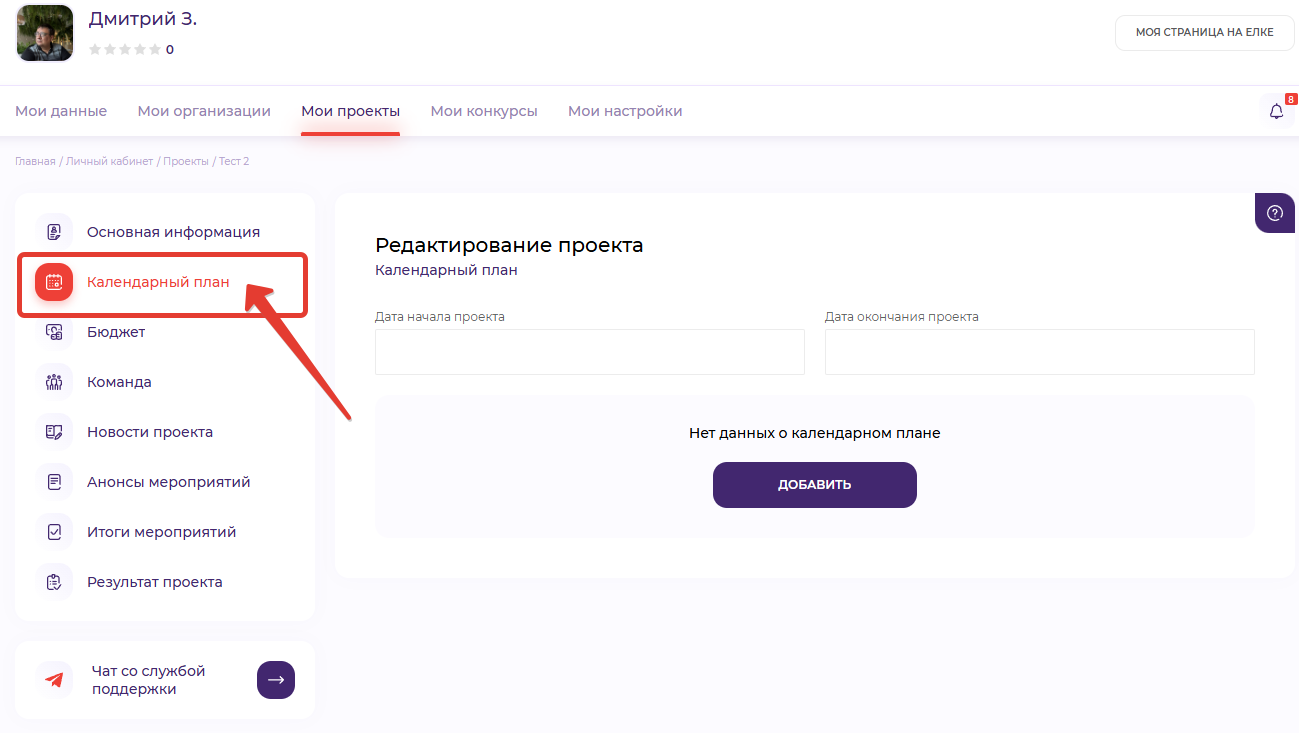 В данной статье мы рассмотрим раздел "Календарный план". Для этого в левой части экрана, в меню редактирования проекта, перейдем в соответствующий пункт.