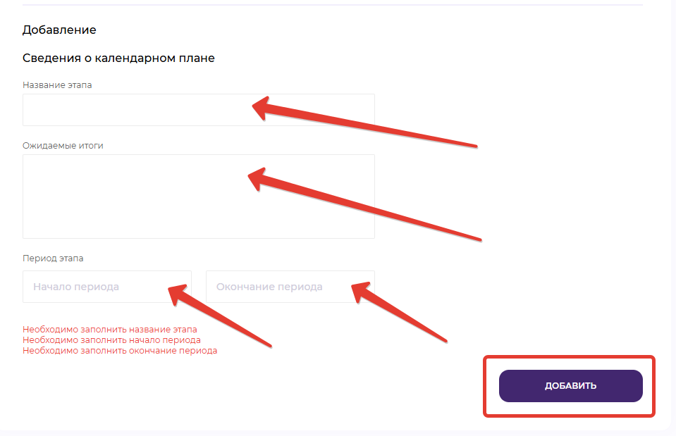 В появившемся окне вводим всю необходимую информацию для составления календарного плана: указываем даты старта и завершения проекта, а для внесения дополнительной информации нажимаем кнопку "Добавить".