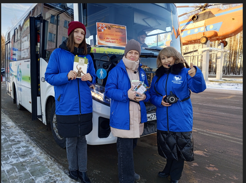 В Белоярском организаторы Акции "Читающий автобус "Победа помнит Героев"» вместе с волонтерами собрались у мемориала в Сквере Победы, чтобы почтить память героев войны. Они открыли Акцию словами: «Сегодня наша страна отмечает государственный праздник - День народного единства и день воинской славы России. Поздравляем всех с этим праздником» и прочитали стихи о Великой Отечественной войне, а затем в зале ожидания автовокзала включили для пассажиров цифровой аудиоролик с декламацией художественного чтения отрывков из произведений авторов-фронтовиков победителями и призерами Цифрового литературно-художественного конкурса чтецов, проведенного АНО «ЦТЭД» совместно с Государственной библиотекой Югры.