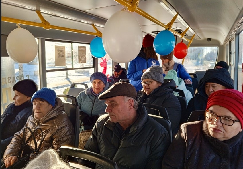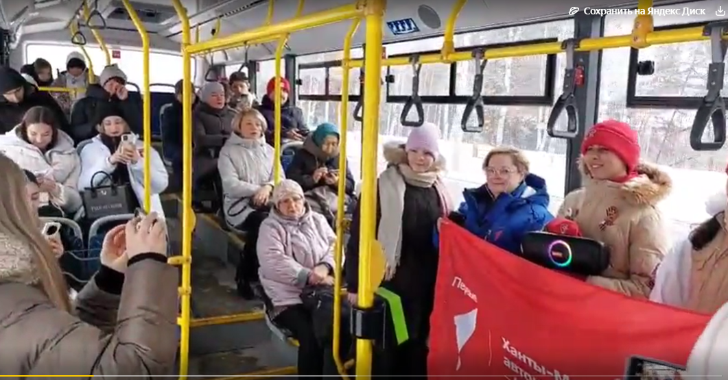 Затем волонтёры проехали по одному из городских автобусных маршрутов, где пели песни военных лет вместе с пассажирами, рассказывали им стихотворения, слушали аудиоролик.