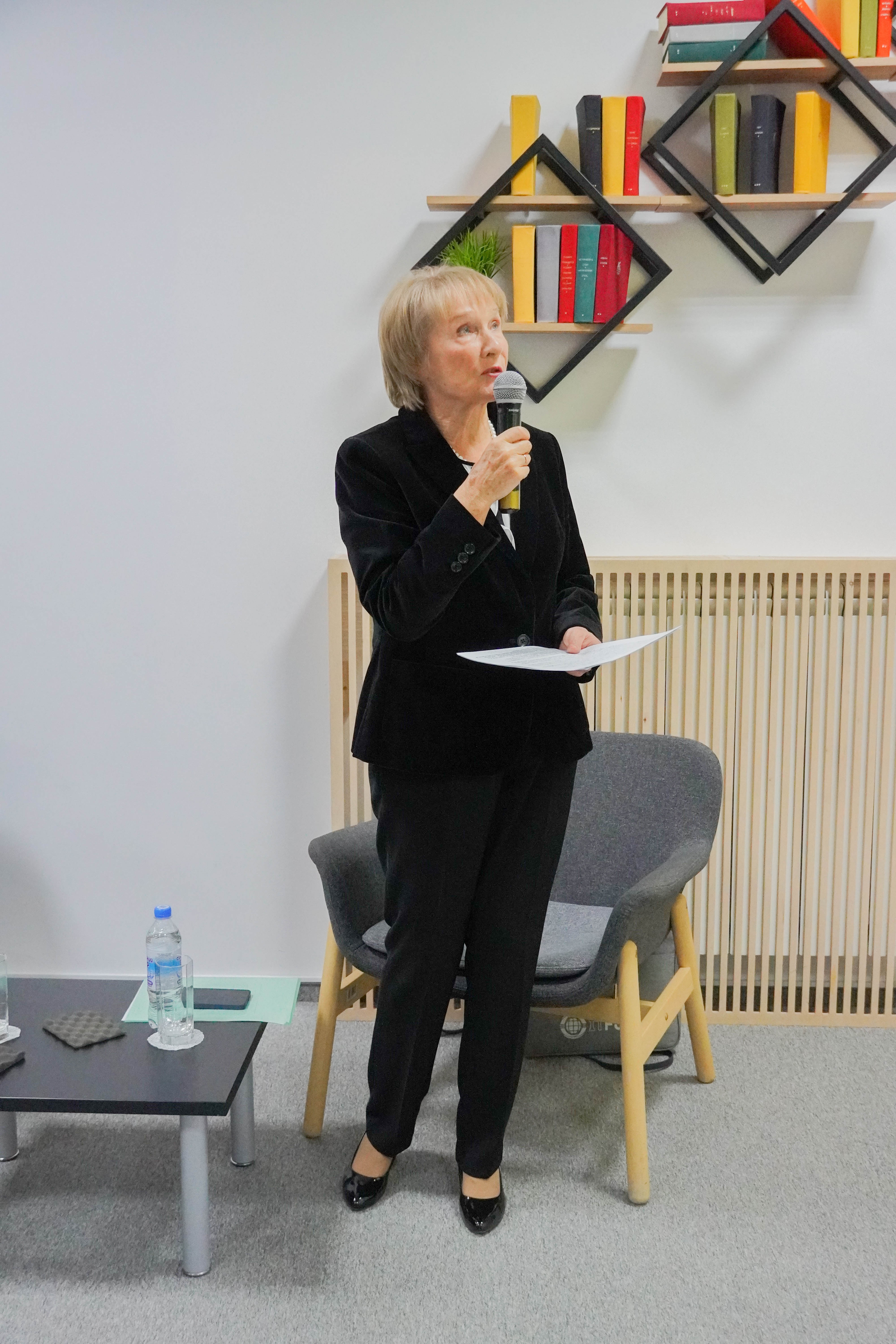 Затем выступила Елена Николаевна Русяева, руководитель Культурно-просветительского центра Д.А. Гранина Библиотеки № 9 имени Даниила Гранина города Санкт-Петербурга.