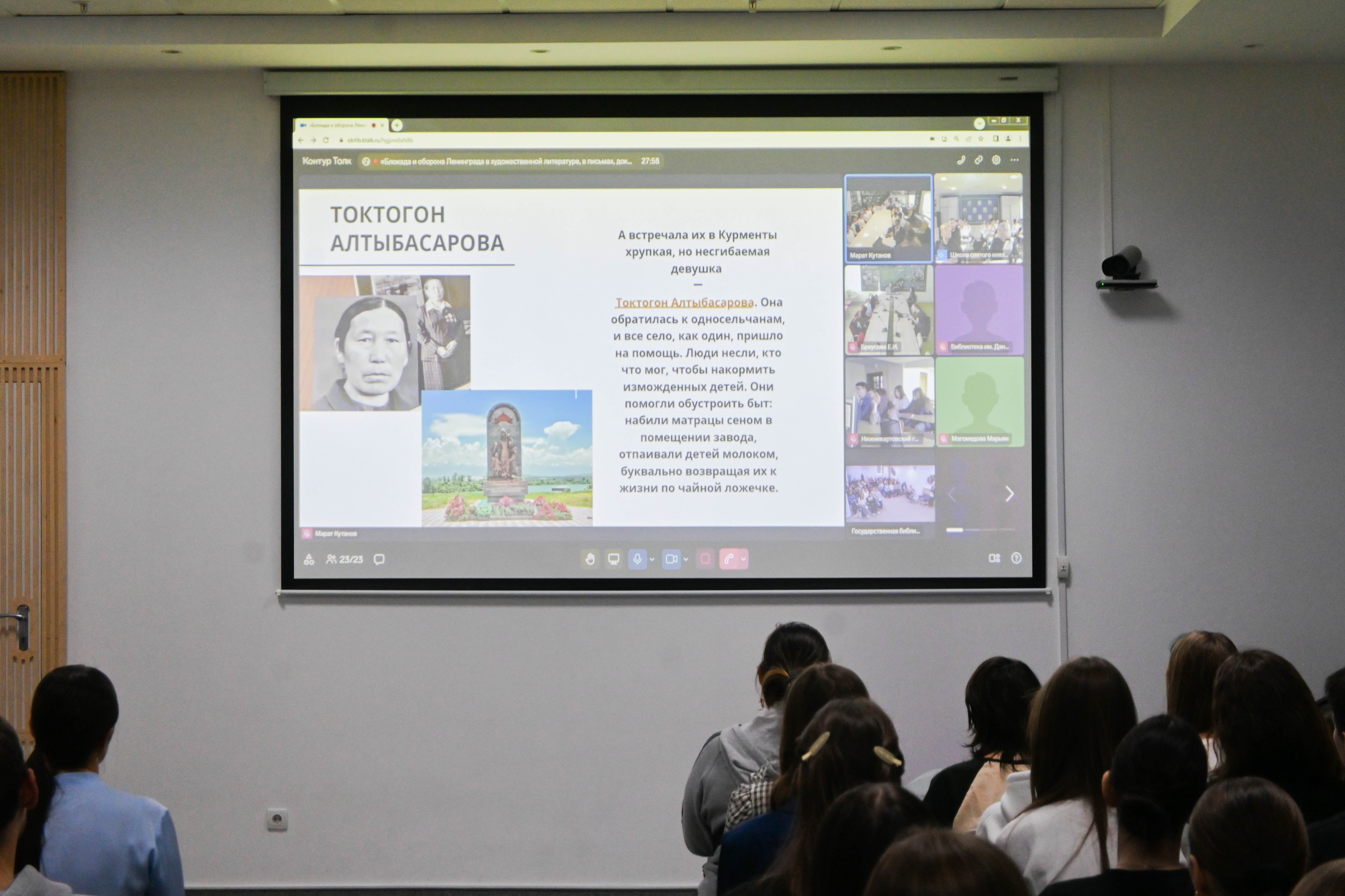 Марат Асанбекович выступал из Музея истории блокады Ленинграда, где были студенты Бишкекского финансово-экономического техникума и с приветствием к участникам Конференции обратились председатель студенческого совета техникума и руководитель Тимуровского движения, деятельность которых направлена на сохранение памяти о героях Великой Отечественной войны и блокады Ленинграда.