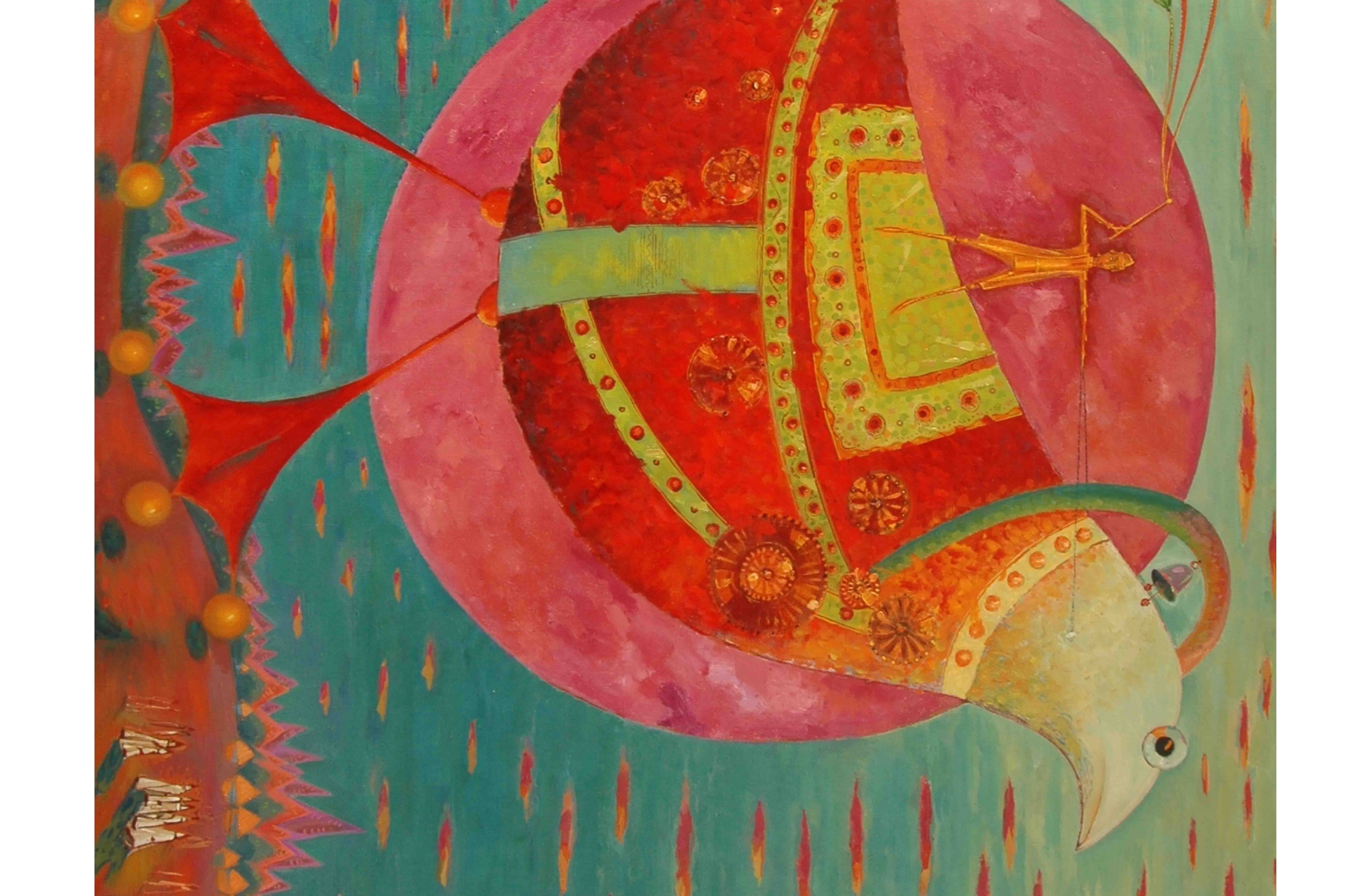 Семь желтых перьев в хвосте птицы – это семь дней недели, она как «не останавливающийся двигатель жизни», постоянно идет вперед. Птица идет огромными шагами через овраги, из одной деревни в другую, но движется она не столько в пространстве, сколько во времени, одна ее нога в настоящем, другая – в прошлом, ведь душа нашего героя тянется в прошлое, увидев которое, успокаивается. Перья хвоста символизируют не только дни, но и связь человека во времени. Красный цвет птицы, – говорит художник, – «красная нить с древних времен к моим картинам», это воплощение души, связь прошлого с будущим.