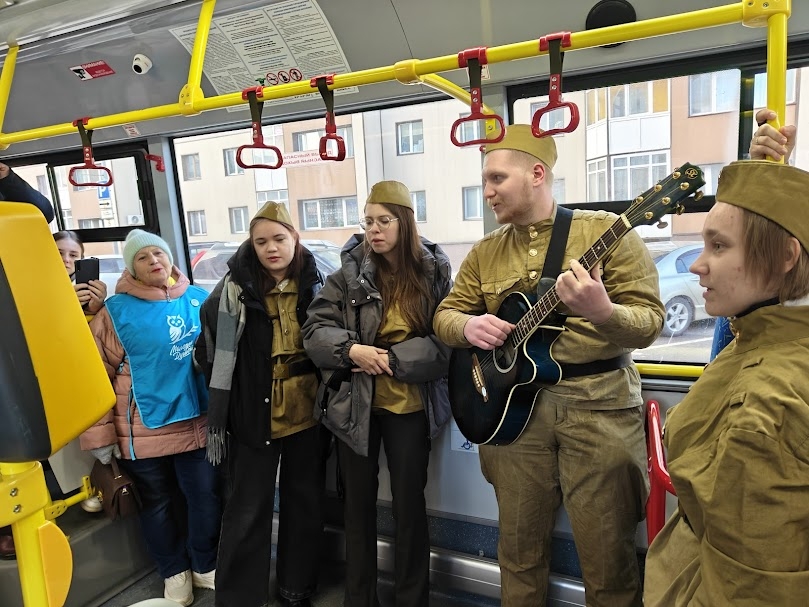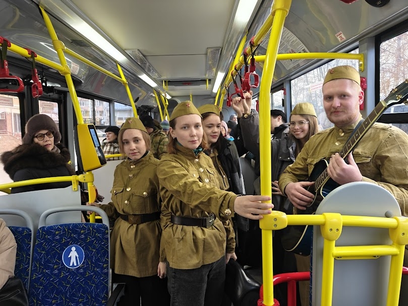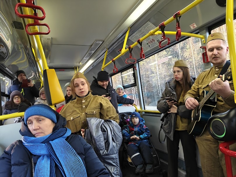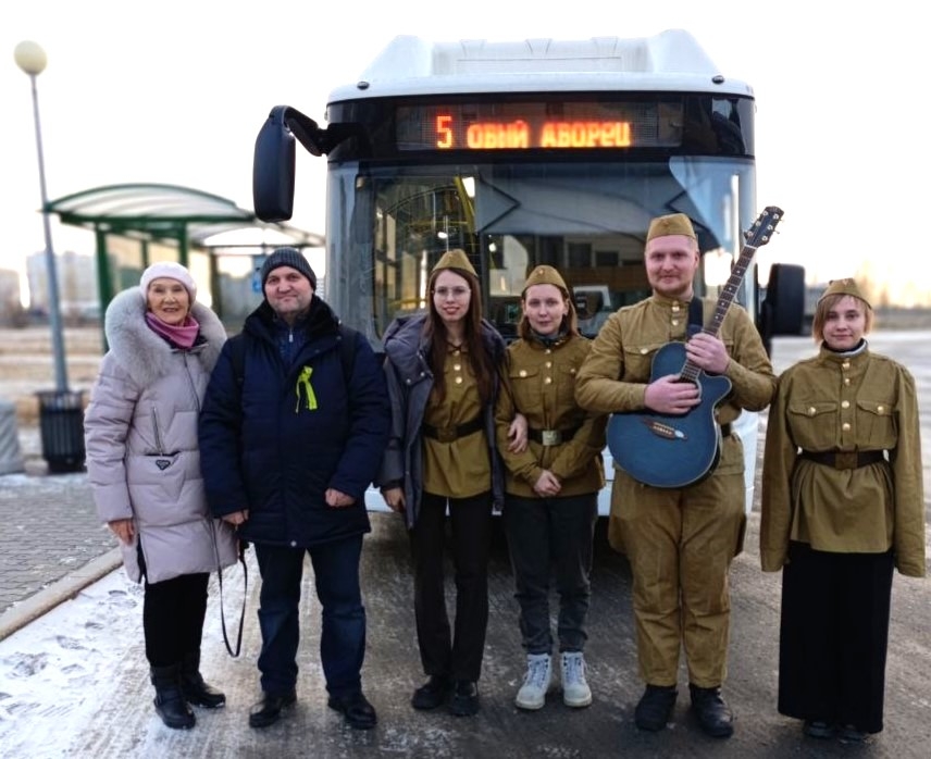 Акция «Читающий автобус. Победа помнит героев» продолжилась в новом большом автобусе на городском маршруте № 5. Там «вживую» читали стихотворения о войне, блокаде и обороне Ленинграда волонтёры Победы под руководством Ярослава Белоусова. Это постоянные участники проектов АНО «ЦТЭД», студенты ХМПТК: Анастасия Конева, Елизавета Шулдикова, Анна Плотникова, Дарина Фарахутдинова. Они под гитару исполняли песни военных лет, такие как: «Смуглянка», «Журавли», «Катюша», «День Победы» и другие. После «живого» исполнения транслировался цифровой аудиоролик с творческими работами победителей и призеров Цифрового литературно-художественного конкурса чтецов «Победа помнит героев».