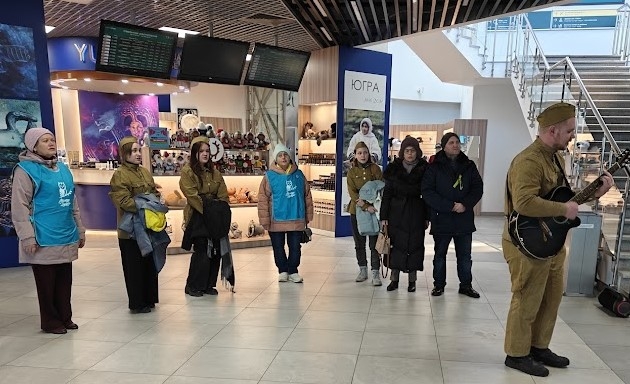 По ходу маршрута организаторы и волонтеры сделали короткую остановку в аэропорту г. Ханты-Мансийска, где также спели песни и прочитали стихи для пассажиров авиарейсов и посетителей.