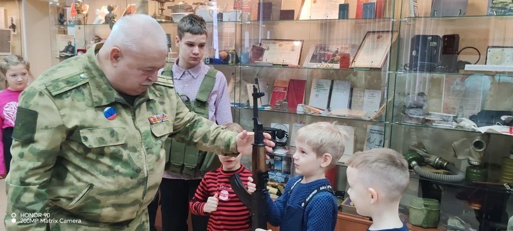 Он рассказывал о серьезных вещах так интересно и с юмором, что даже самые непоседливые ребята слушали затаив дыхание. Дети смогли не просто посмотреть на экспонаты, а буквально прикоснуться к истории: посидели за школьной партой 70-х годов, подержали в руках настоящее оружие и даже примерили тяжелые бронежилеты.