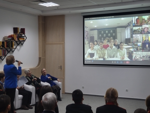 Ведущая мероприятия передала слово Елене Аркадьевне Цветковой, руководителю Библиотеки пос. Комарово (г. Санкт-Петербург), которая отметила: «Даниил Александрович Гранин очень тепло относился к библиотекам и много лет был нашим читателем и другом, его всегда интересовало, что читает молодежь». Она поблагодарила организаторов за проведение очень интересных мероприятий в рамках проекта и зачитала приветствие от Марины Данииловны Чернышевой-Граниной, руководителя Фонда сохранения и популяризации наследия Даниила Гранина, почетного председателя Оргкомитета проекта. В приветствии Марина Данииловна отметила: «Оказалось, что именно в Сибири активно помнят и читают писателей и поэтов времен войны. И в этом, прежде всего, заслуга многих организаций Югры и общества блокадников Кыргыстана. Именно потомки участников войны и блокадников, эвакуированные в эти, казалось бы, далекие края, читают книги о войне, декламируют стихи Симонова, Гамзатова, Воронова, Семена Ботвинника. Мероприятия, которые проводятся Центром технологий электронной демократии совместно со многими организациями Югры, интересны как для молодежи, так и для взрослых. Например, «читающий автобус» позволяет людям по дороге на работу или домой слушать стихи и отрывки из произведений авторов-фронтовиков, подпевать песням военных лет. Очень важно, что в конкурсе чтецов участвовали люди не только из Югры, но к ним присоединились и Казахстан, и Кыргызстан. У нас общая история, мы помним подвиги наших предков. Они всегда рядом. И за это мы благодарны организаторам и тем, кто читает стихи, вспоминает песни военных лет. Спасибо всем, за эту память!».