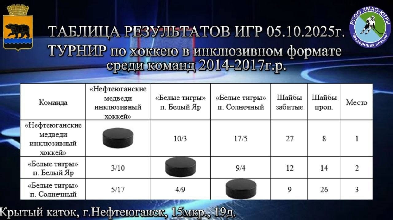 Апробацию соревновательного процесса считаем успешной. Внедрен формат соревнований, когда хоккеисты с ОВЗ играют против хоккейных команд без ограничений здоровья. Стоит учесть факт того, что состав команды Нефтеюганские Медведи имел игроков и с ОВЗ и без ограничений здоровья, но так как играли хоккеисты с ОВЗ с командами, в которых нет игроков с ограниченными возможностями, все хоккеисты без ограничений- то это смело можно назвать новым форматом, новым подходом в части организации и проведения инклюзивных соревнований.