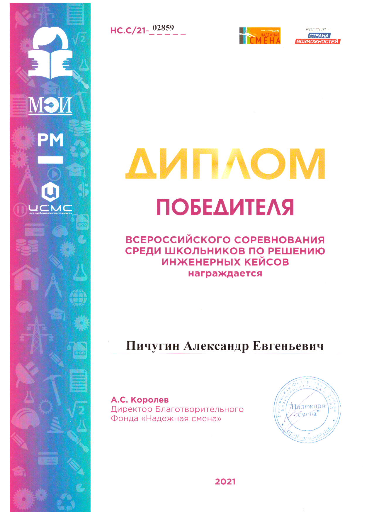 Диплом победителя Всероссийского соревнования по решению инженерных кейсов (CASE-IN)
