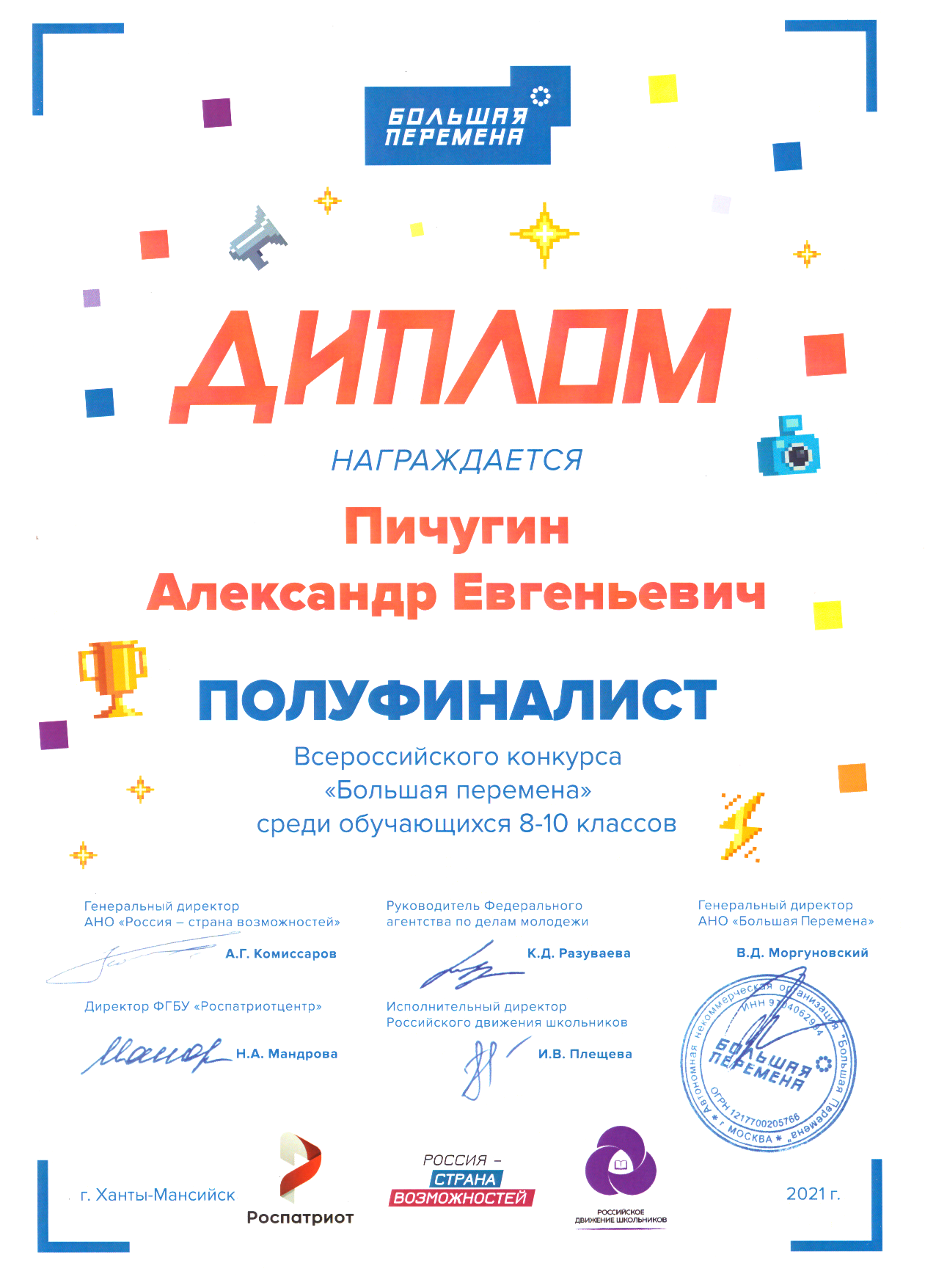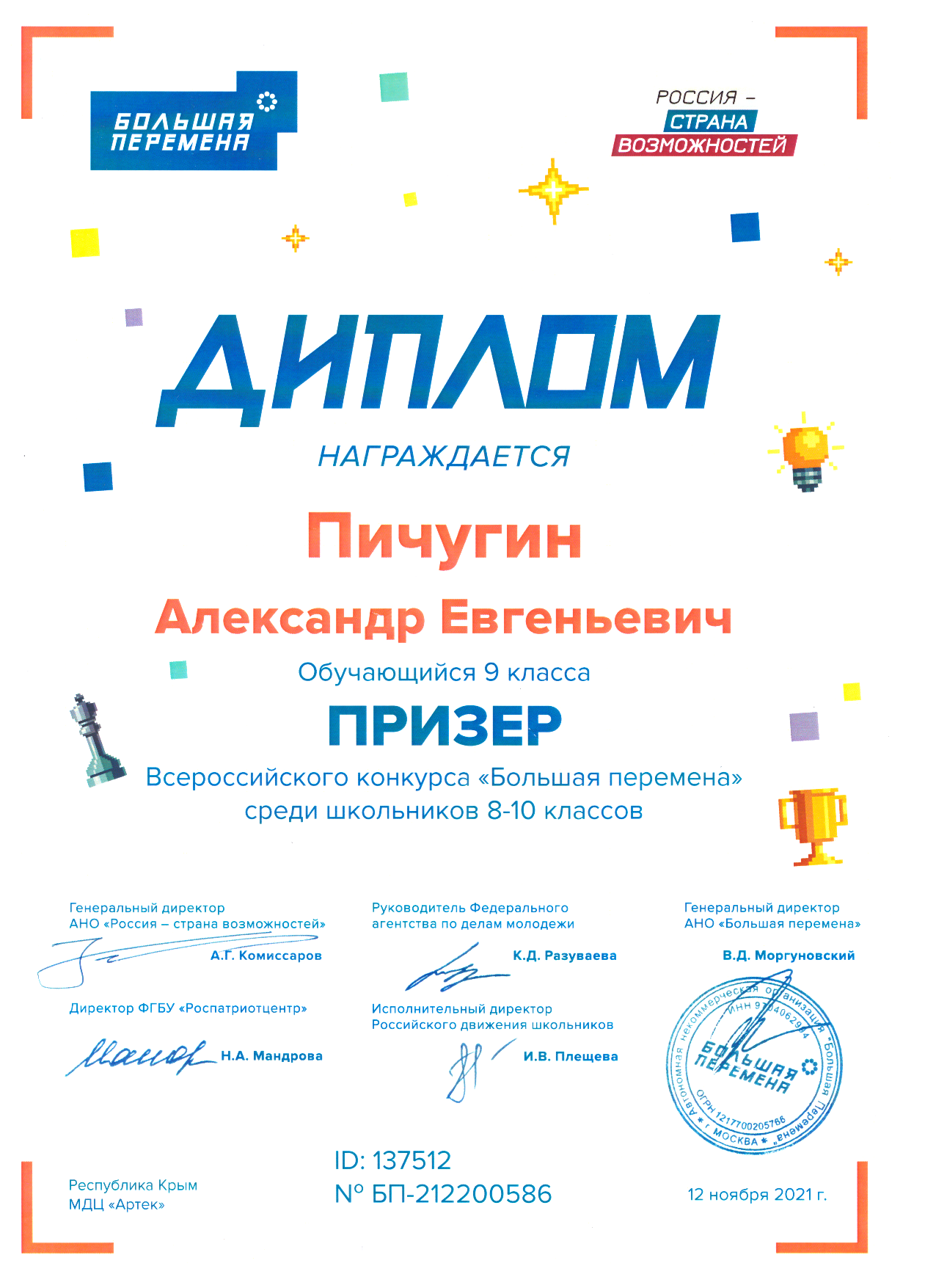 Диплом победителя Всероссийского конкурса "Большая Перемена"