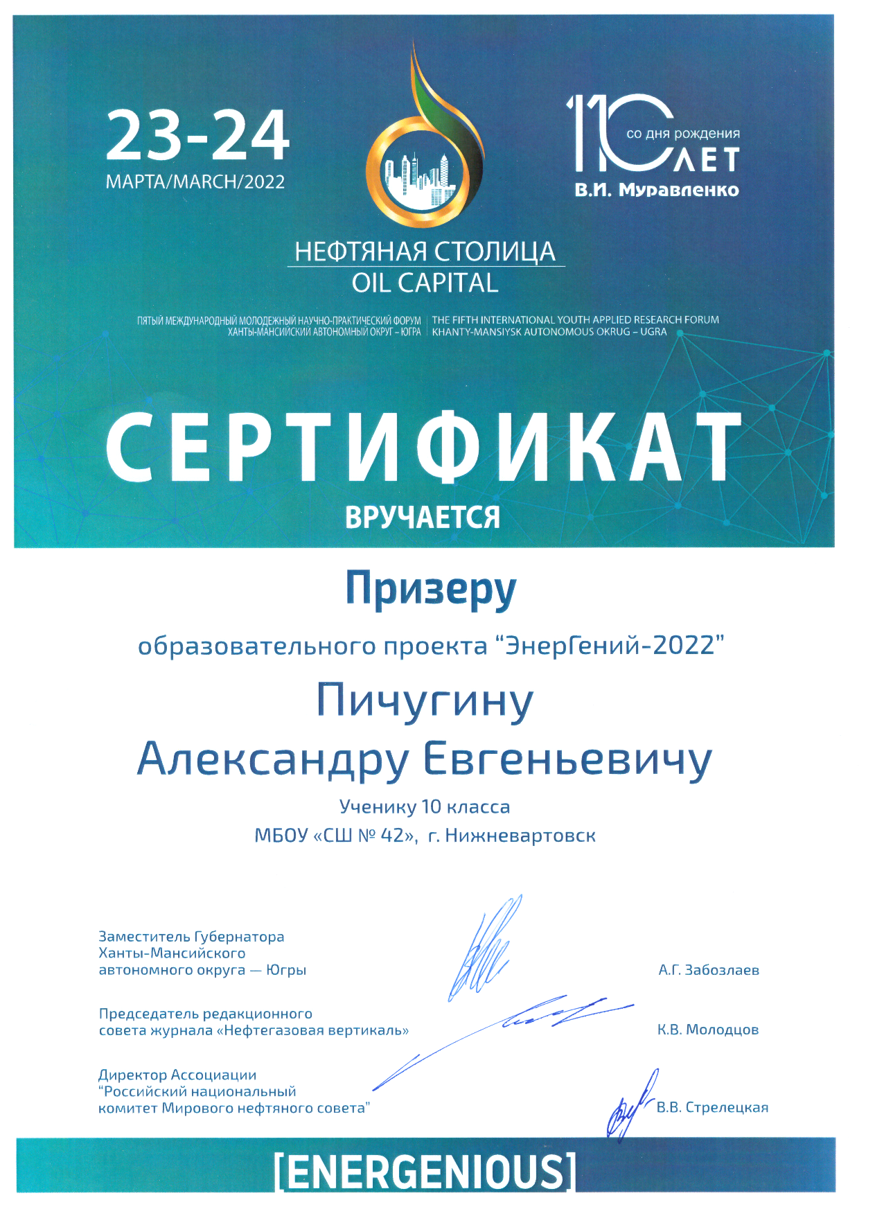 Сертификат призера образовательного проекта "ЭнерГений-2022"