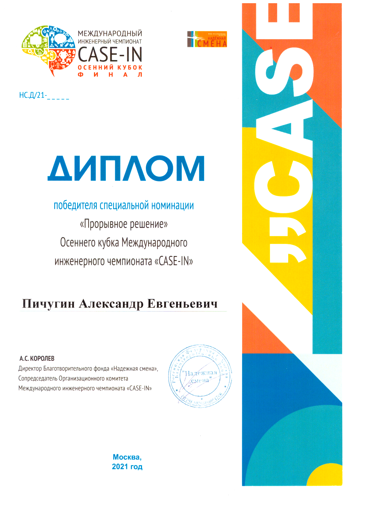 Диплом победителя специальной номинации "Прорывное решение" Осеннего кубка Международного инженерного чемпионата "CASE-IN"