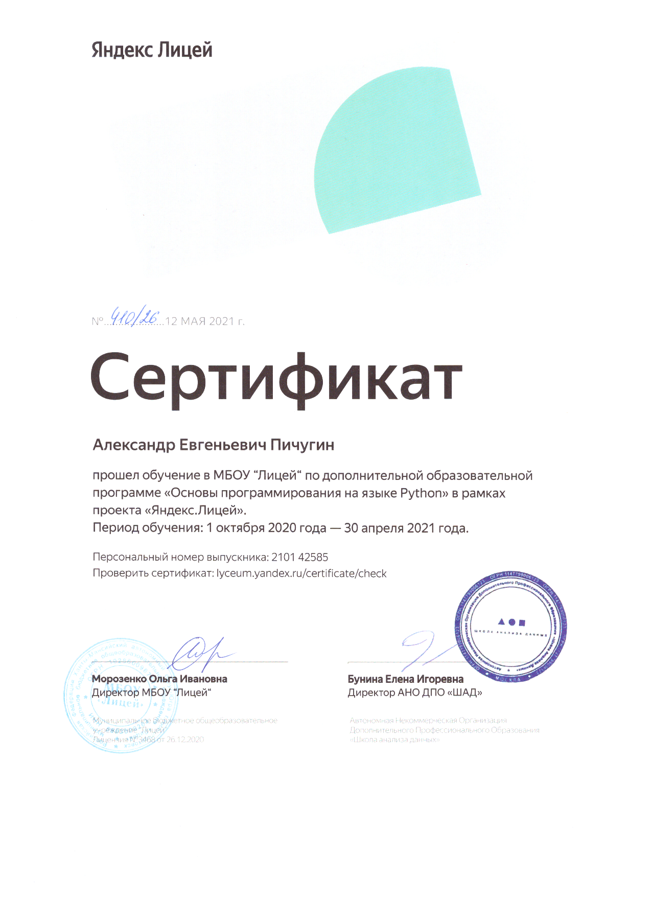 Сертификат об окончании 1 курса Лицея Академии Яндекса