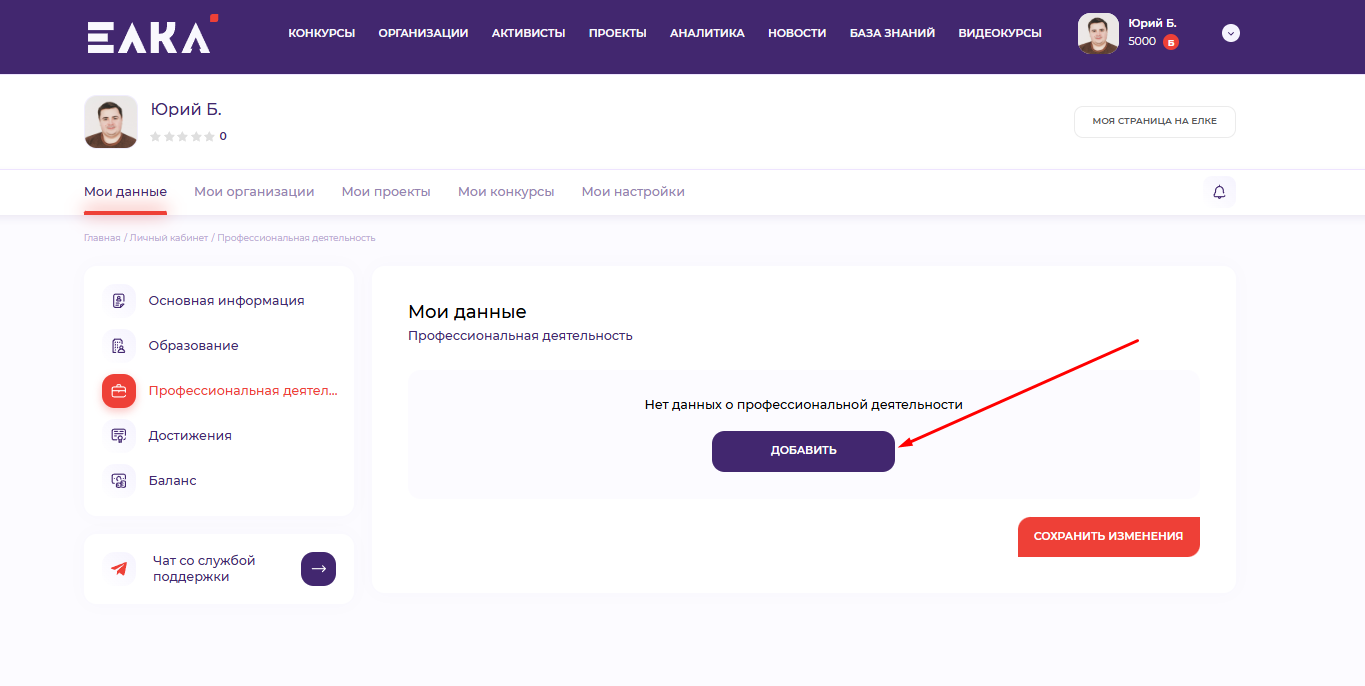 Для этого во вкладке “Профессиональная деятельность” нажмите на кнопку “Добавить” и в появившемся окне заполните все поля и нажмите на фиолетовую кнопку “Сохранить”, после этого информация сохранится в виде отдельного блока: