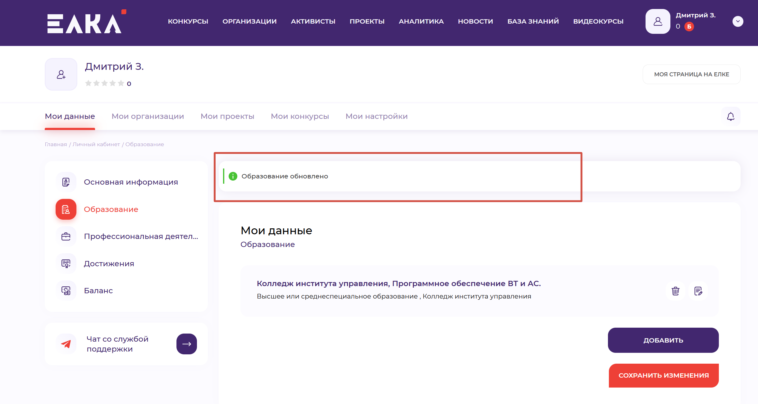 После ввода информации по всему разделу не забудьте нажать кнопку “Сохранить изменения”, после нажатия вверху страницы отобразиться результат сохранения, обратите на него внимание, должно быть так: