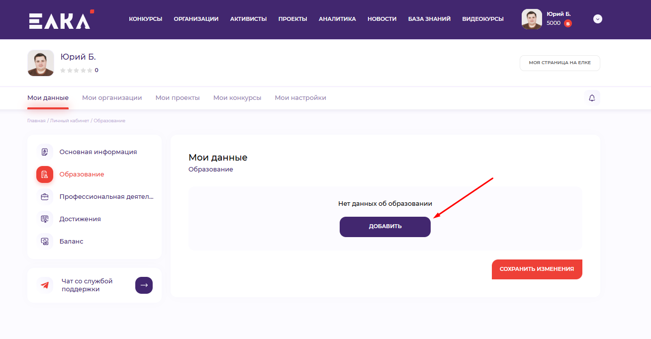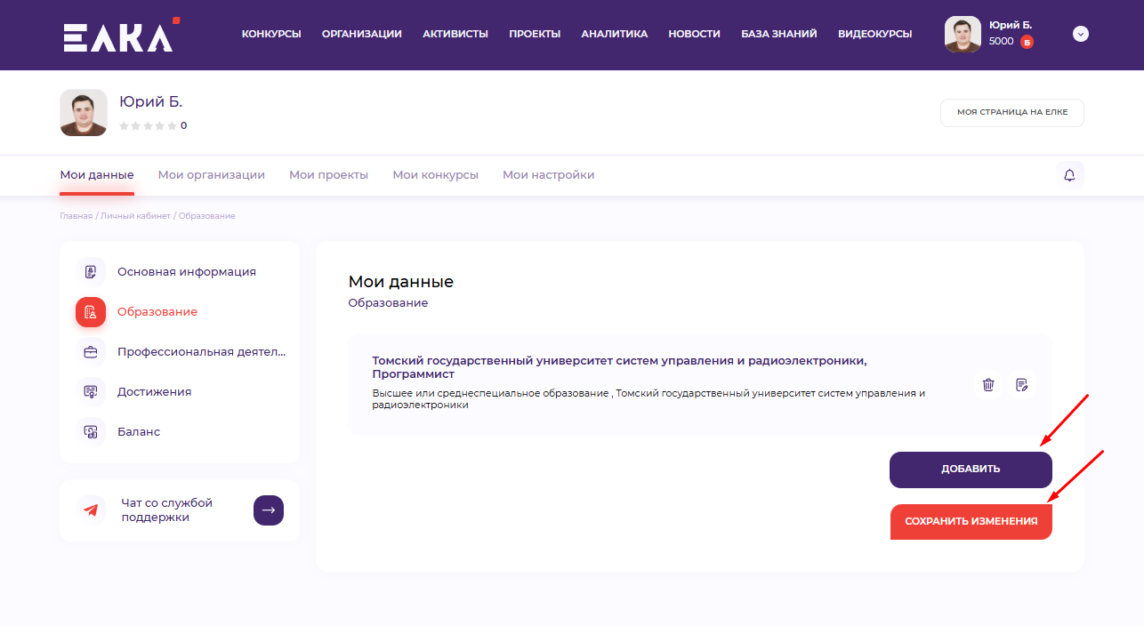 Здесь отображается всё указанное вами образование, речь идет не только высшем или среднем, но и о не менее важных дополнительных курсах повышения квалификации или образовательных программах Фонда.