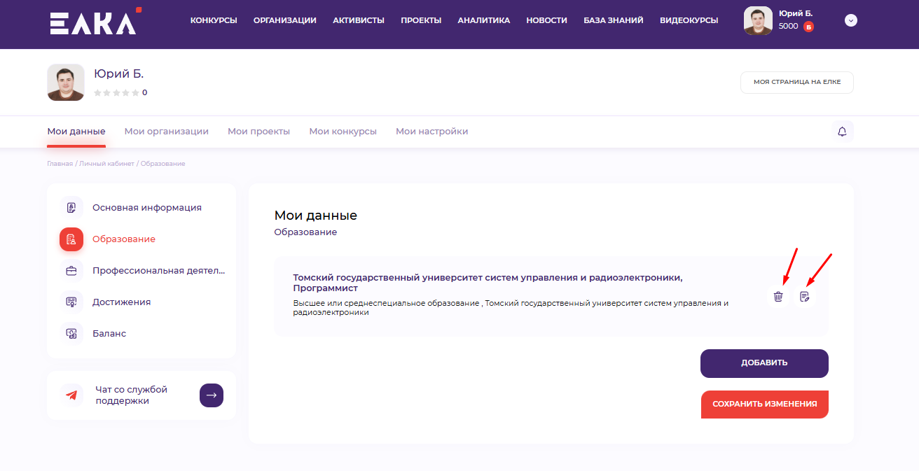 Блок с образованием можно редактировать или удалить нажав на соответствующие кнопки в блоке.