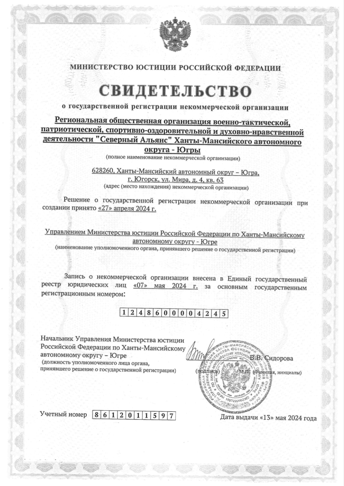 РЕГИОНАЛЬНАЯ ОБЩЕСТВЕННАЯ ОРГАНИЗАЦИЯ ВОЕННО-ТАКТИЧЕСКОЙ, ПАТРИОТИЧЕСКОЙ, СПОРТИВНО-ОЗДОРОВИТЕЛЬНОЙ И ДУХОВНО-НРАВСТВЕННОЙ ДЕЯТЕЛЬНОСТИ СЕВЕРНЫЙ АЛЬЯНС ХАНТЫ-МАНСИЙСКОГО АВТОНОМНОГО ОКРУГА-ЮГРЫ