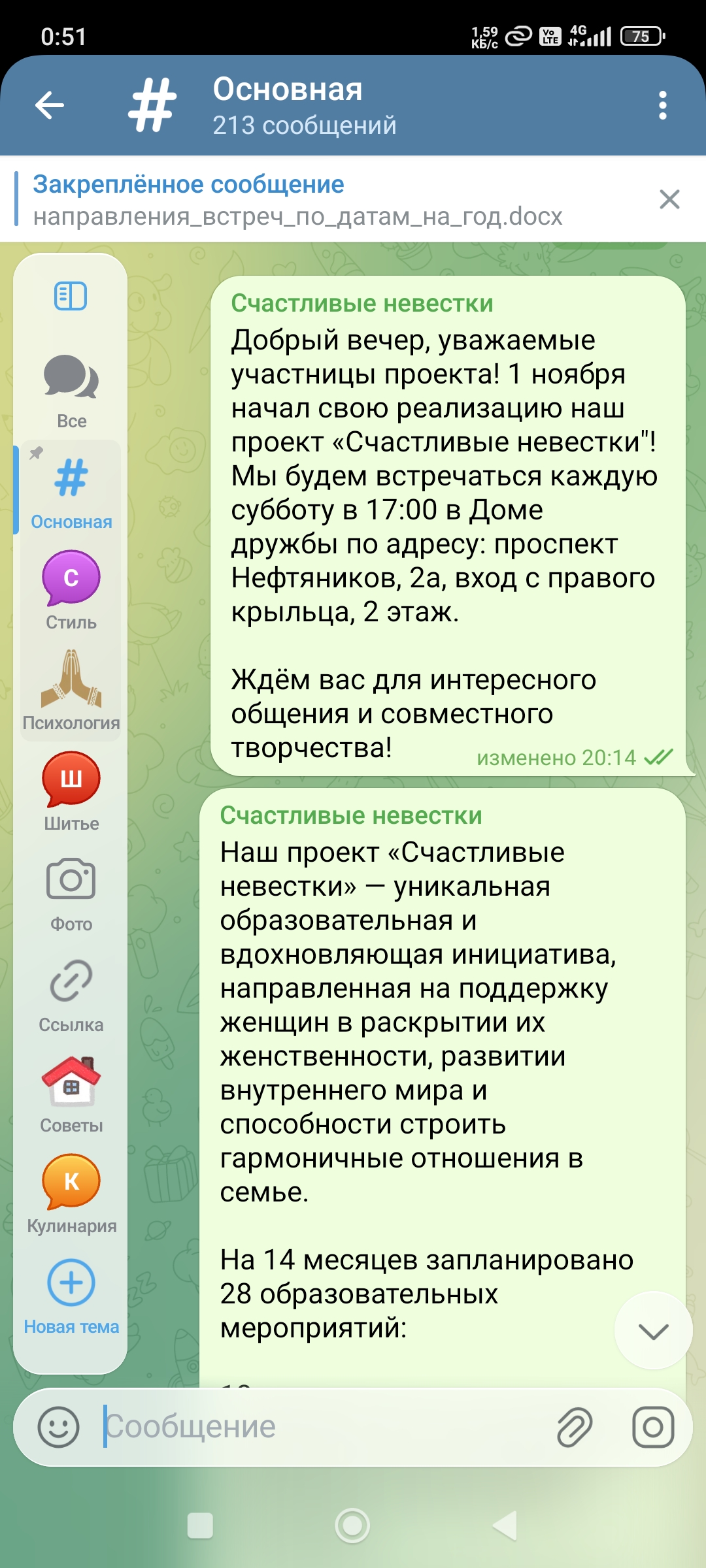 Национальный семейный проект «Счастливые невестки» — это уникальная образовательная и вдохновляющая инициатива, направленная на поддержку женщин в раскрытии их женственности, развитии навыков грамотного общения с детьми и построении гармоничных отношений с мужем, свекровью и близкими. Проект способствует не только личностному росту, но и созданию крепкой, счастливой семьи.Особое значение проект приобретает в многонациональном городе Когалыме, где проживают представители более 80 национальностей. Каждая из них делится своими традициями и секретами успешного семейного счастья, что делает проект настоящей площадкой для межкультурного обмена и укрепления семейных ценностей.«Счастливые невестки» — это не просто курс, а возможность для каждой женщины почувствовать свою значимость, красоту и силу, сохранить тепло и любовь в семье, а также внести вклад в повышение рождаемости и устойчивость семейных отношений в регионе.